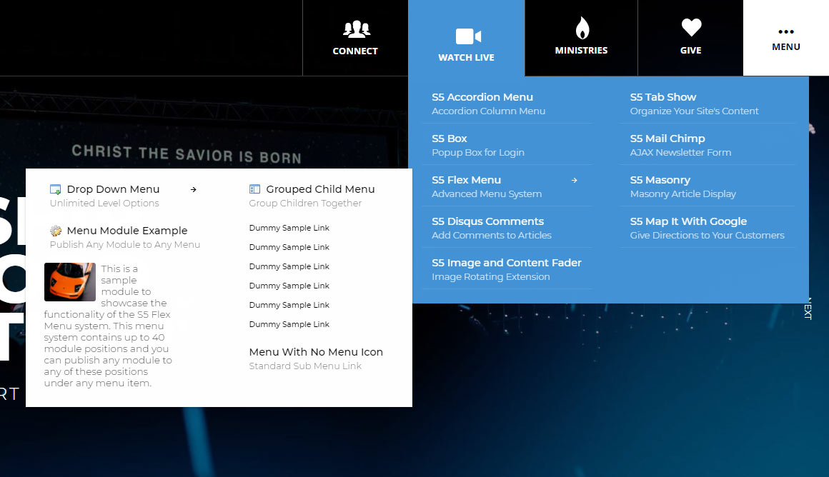 Take your website to the next design level by using the robust and feature rich S5 Flex Menu System. Organize your links with ease and show content in places you never could before!